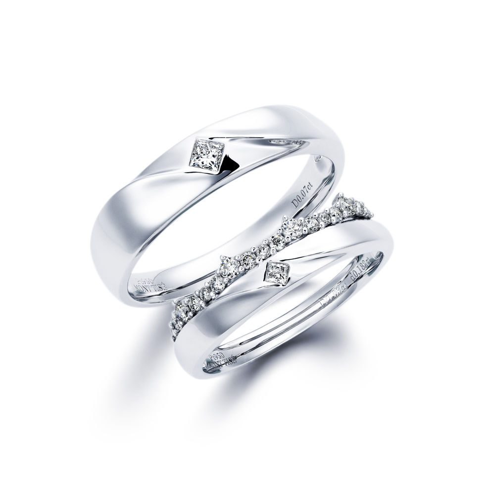 這款對戒巧妙地演繹了古典童話中公主與騎士的浪漫故事。男戒堅實而純粹,如同一位騎士的堅定與勇敢,而女戒則如同一位高貴的公主,戴著由鑽石綴成的皇冠,璀璨而優雅。男戒以一顆獨立的公主方鑽石為中心,顯示了力量與堅定,女戒則更顯華麗,細小鑽石巧妙鑲嵌成皇冠狀的設計,在優雅的輪廓上加冕,精緻而富有浪漫氣息。