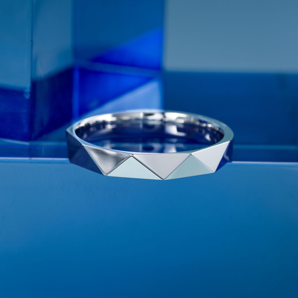 這款男戒以其創新的幾何設計和純淨線條搶眼於世。戒面採用了多面割面設計,猶如現代建築的精緻外觀,反映出光與影的戲劇性交互。簡潔而大膽的輪廓,結合了精密工藝與當代美學,打造出一件既是裝飾品也是藝術品的戒指。這款戒指的設計理念不僅追求視覺沖擊,更彰顯著佩戴者的前衛風格與獨特個性。